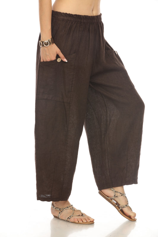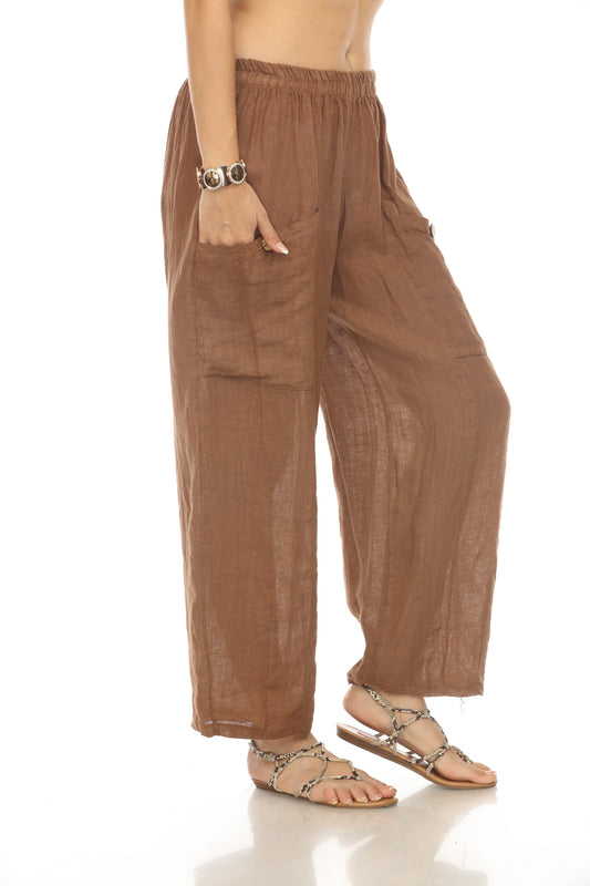 Brown Elastic Waist Wide Leg Pant with Pockets